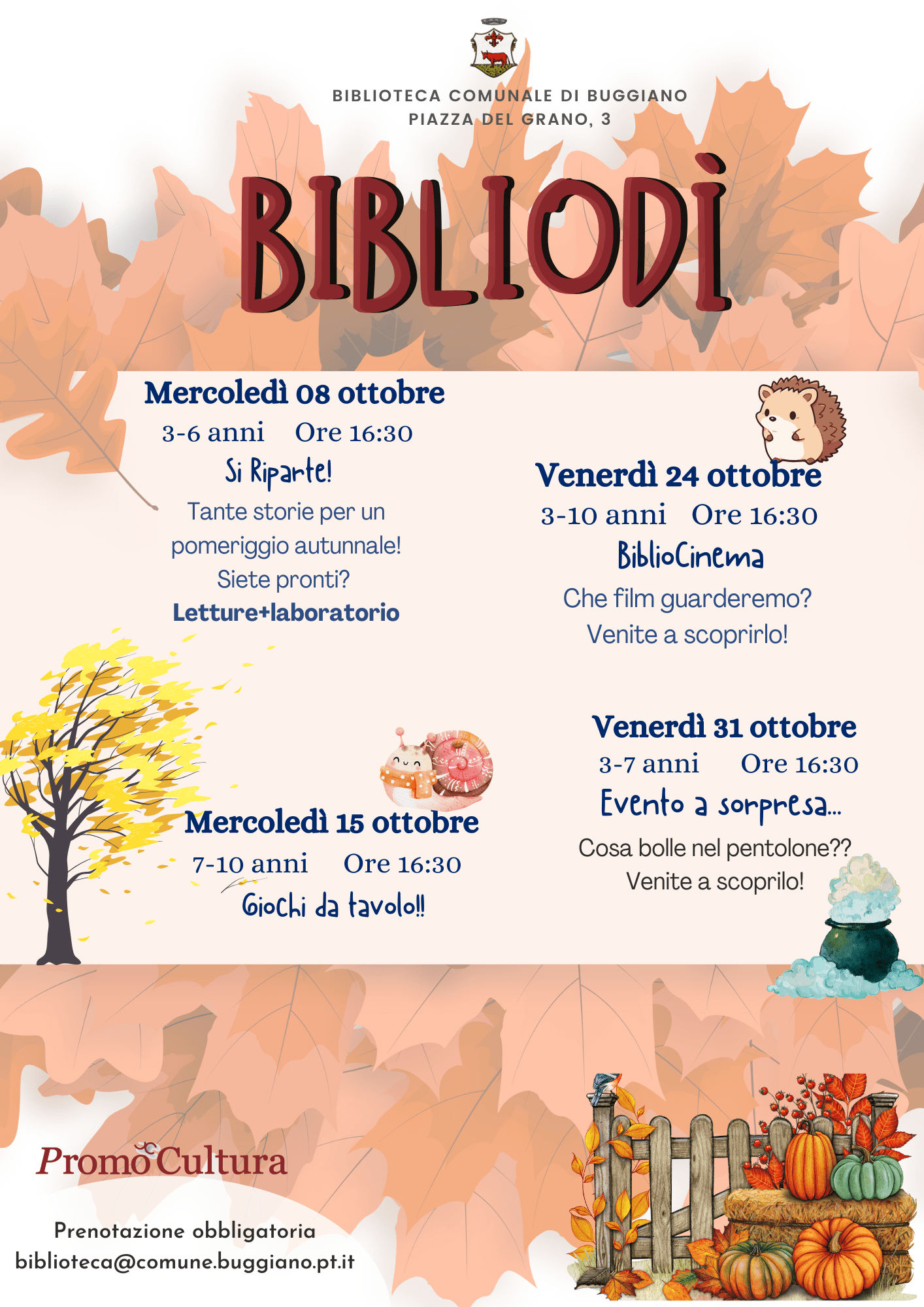 Ripartono i Bibliodì in Biblioteca! Tanti appuntamenti per i bambini tra letture e laboratori. Mercoledì 08 ottobre 3-6 anni Ore 16:30 Si Riparte! Tante storie per un pomeriggio autunnale! Letture+laboratorio Venerdì 24 ottobre 3-10 anni Ore 16:30 BiblioCinema Che film guarderemo? Venite a scoprirlo! Mercoledì 15 ottobre 7-10 anni Ore 16:30 Giochi da tavolo!! Venerdì […]