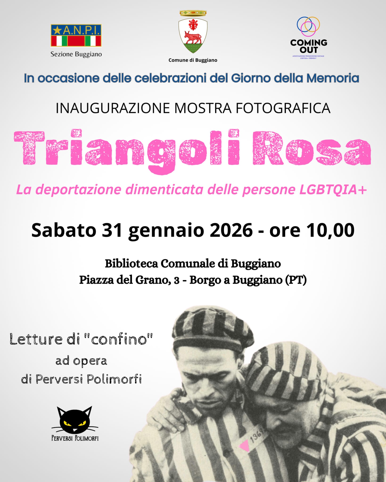 Inaugurazione della mostra fotografica Triangoli Rosa, che di terrà sabato 31 gennaio alle 10.00 in biblioteca. Per l'occasione, la biblioteca sarà regolarmente APERTA con orario 9.00-13.00.