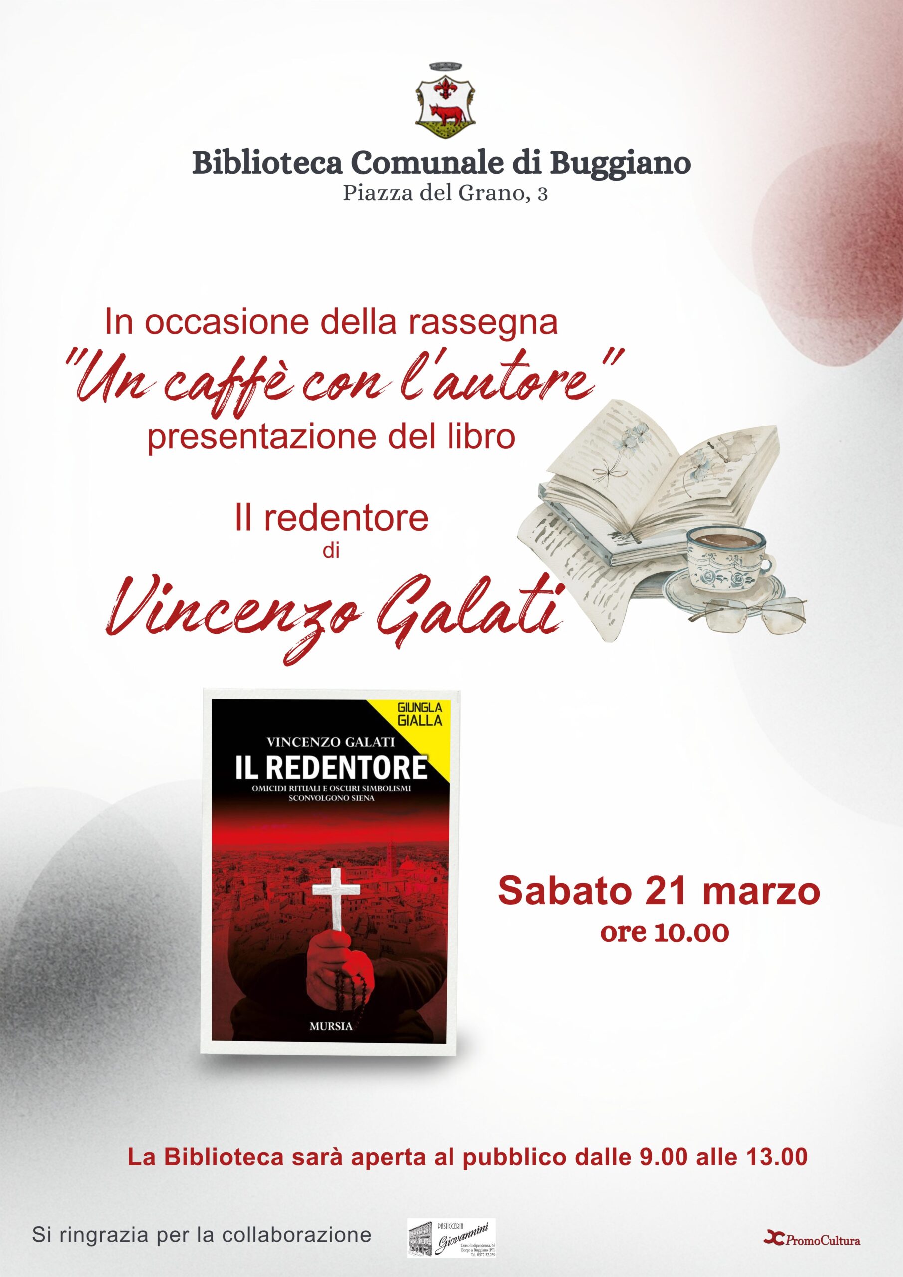 Al termine della presentazione, verrà offerto un piccolo rinfresco. Per l’occasione, la biblioteca sarà regolarmente aperta al pubblico con orario 9.00-13.00.
